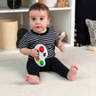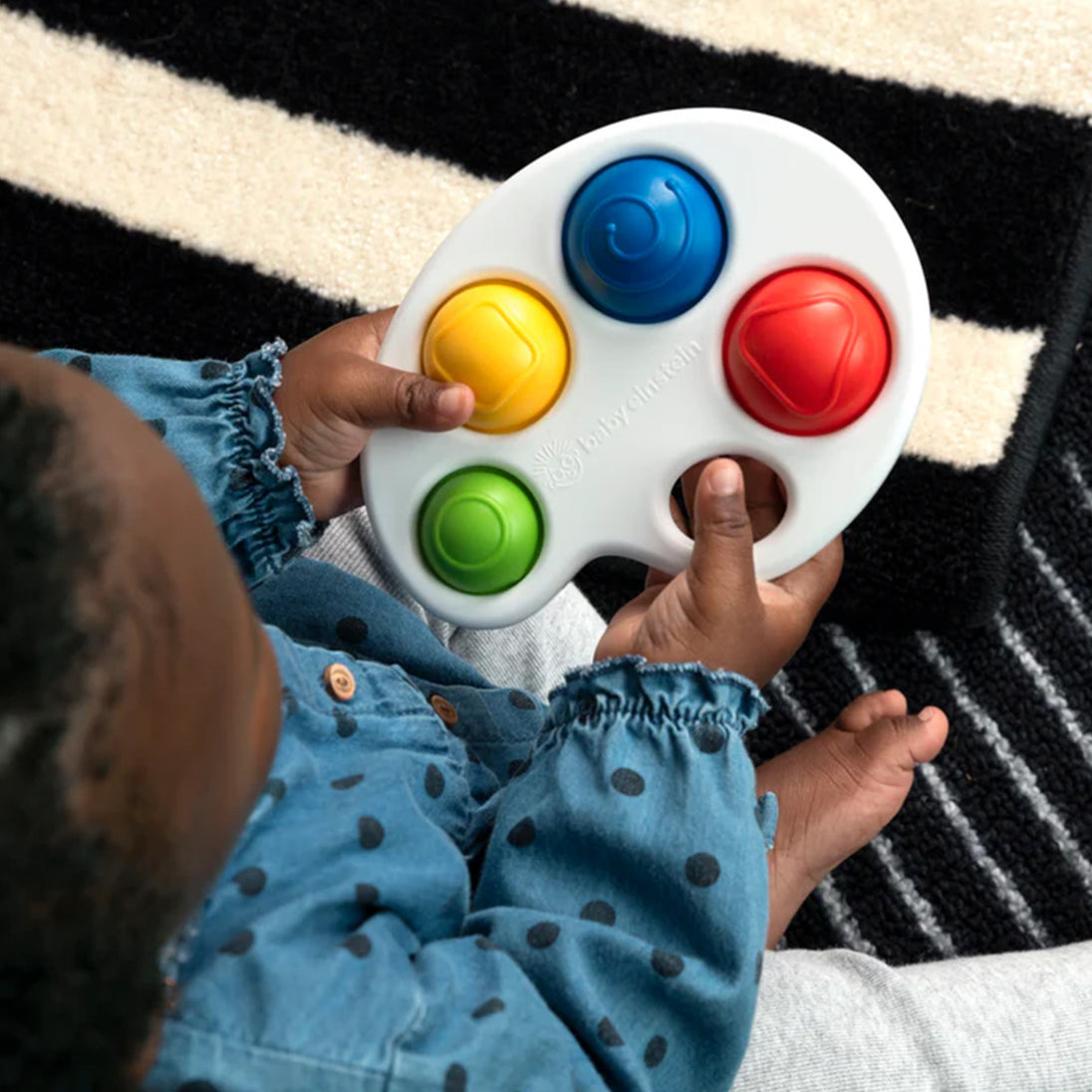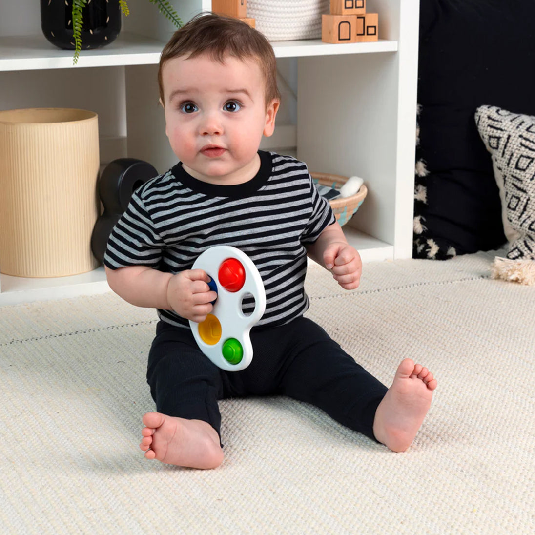 The Color Pop Palette Sensory Toy engages baby with colors and shapes and supports fine motor skills. 4 soft, brightly-colored poppers feature shapes and textures to encourage tactile skills and early shape and color learning.