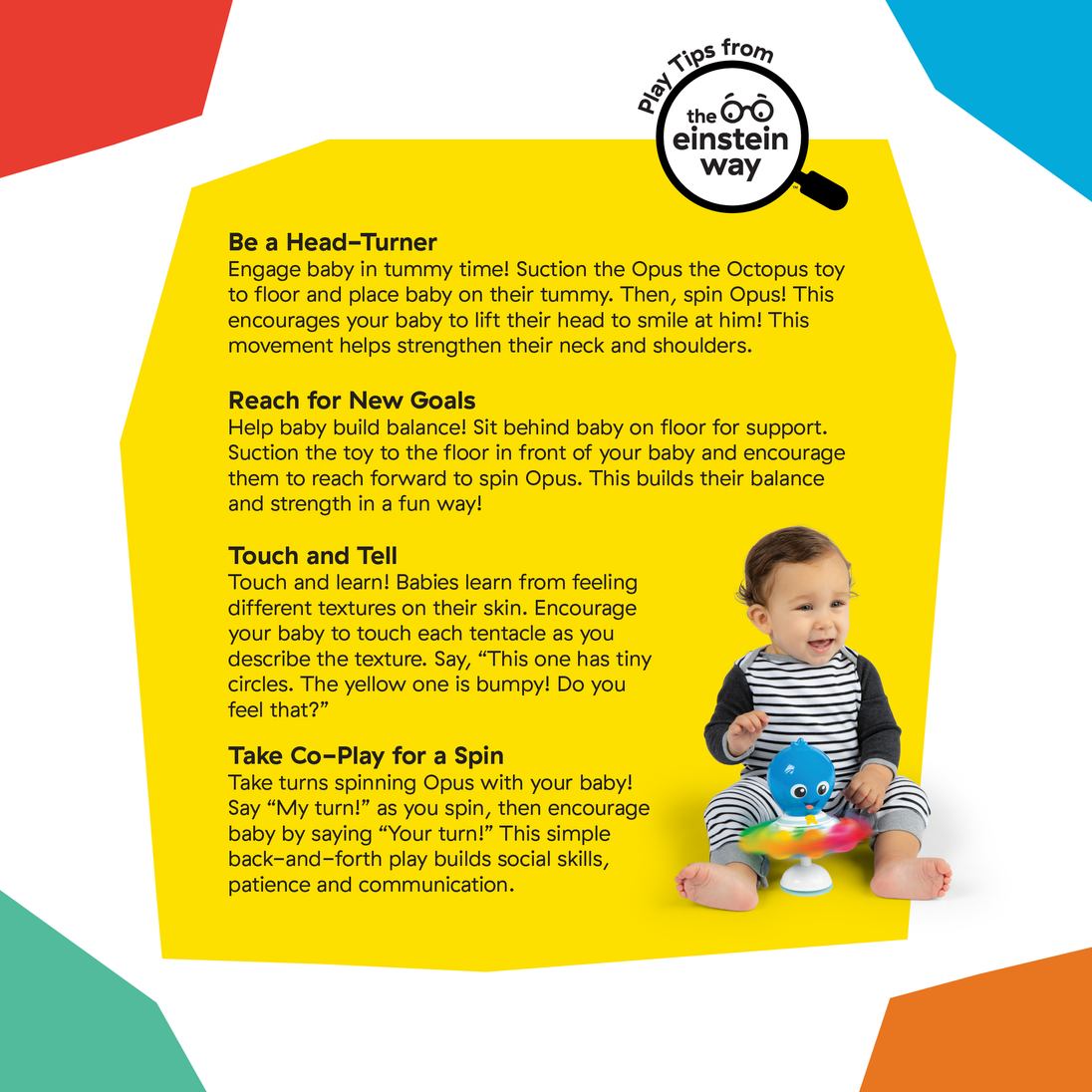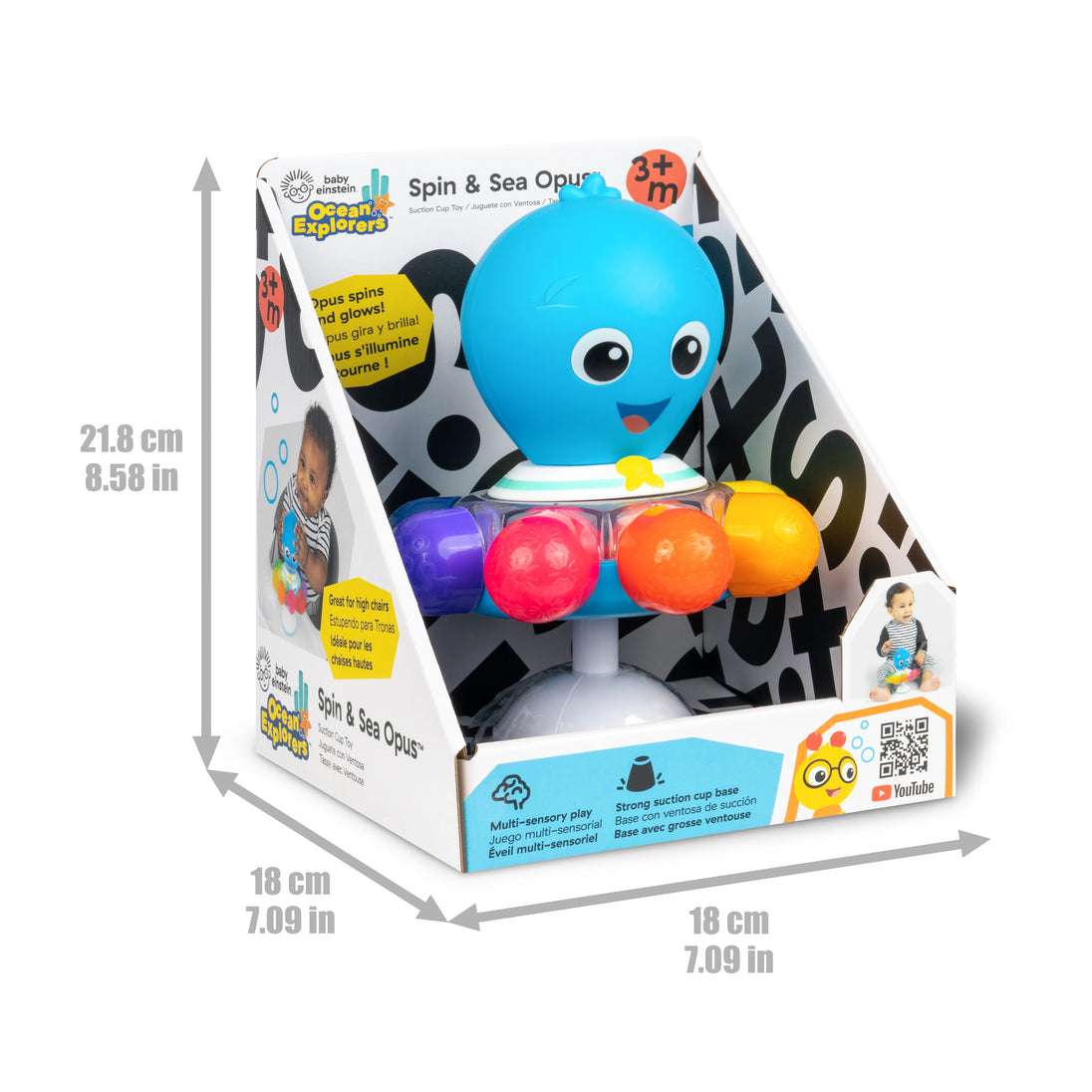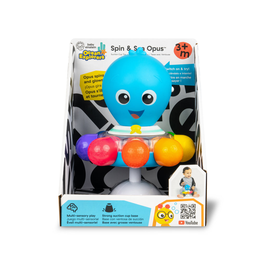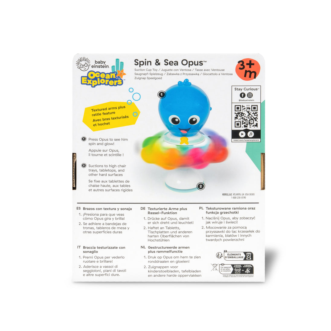 - The Baby Einstein Ocean Explorers Opus's Spin & Sea Suction Cup Toy engages baby’s senses at home and on the go with lights, rattles, textured arms, and vibrant colors.
