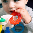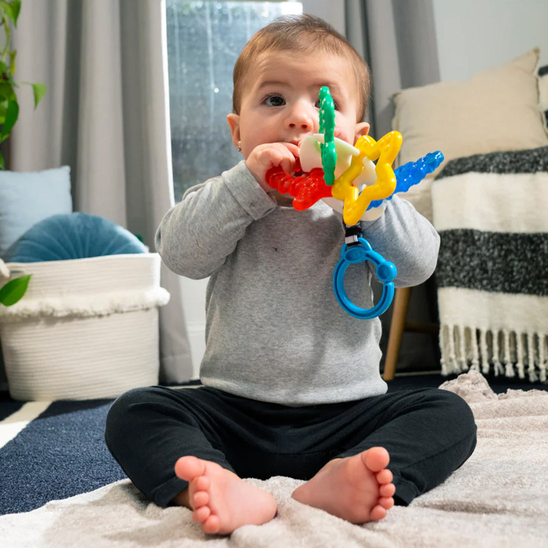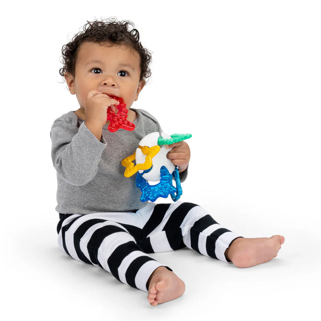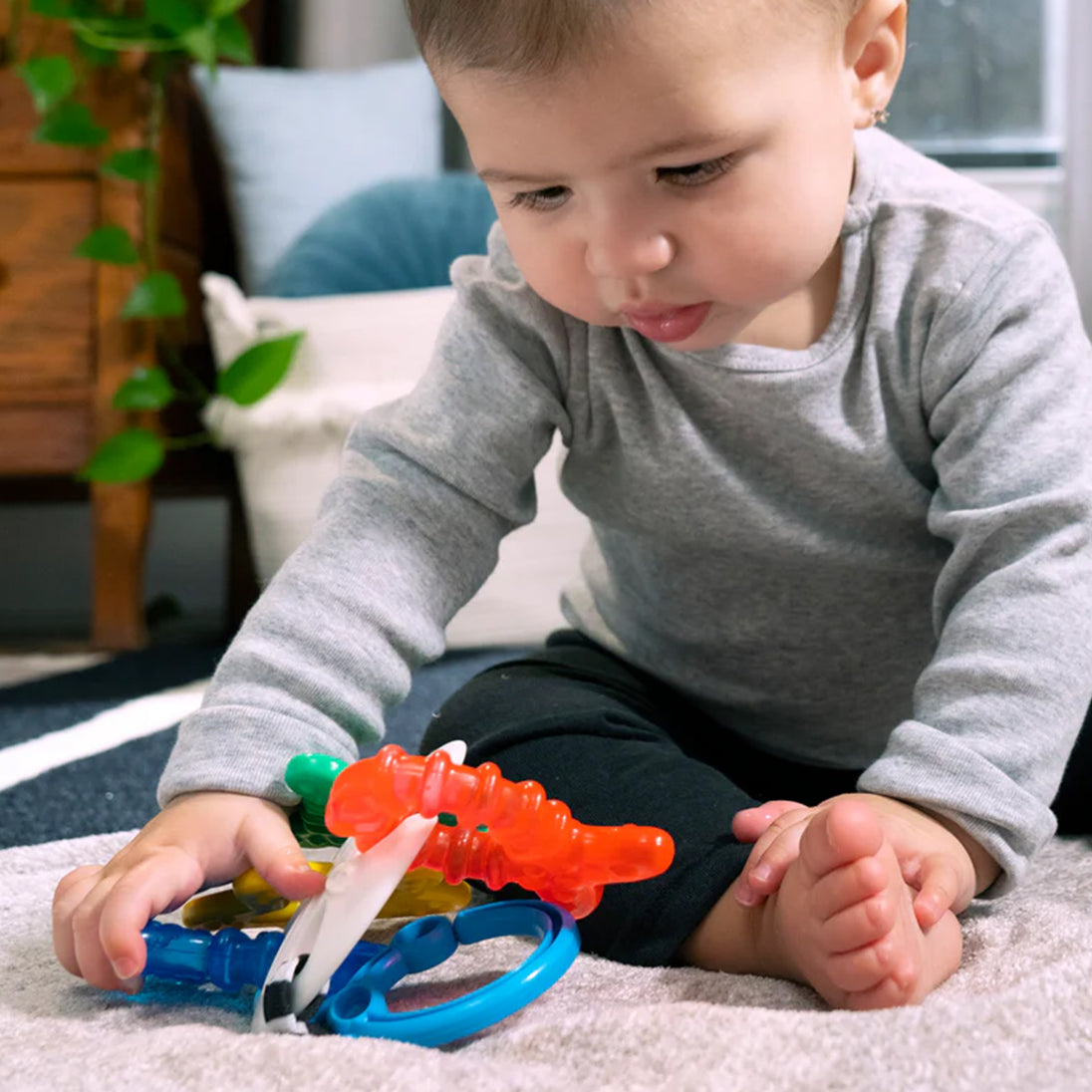 The Baby Einstein Ocean Explorers Sea of Sensory teether is a set of 5 ocean-themed, teething toys that help soothe baby’s sore gums and engage baby with vibrant colors and unique textures.
