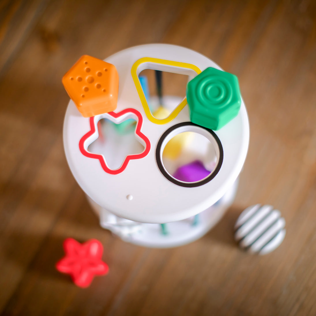 - Open-ended play – Turn, spin, stretch, & sort! This multi-sensory shape sorter offers endless ways to play, discover, and explore. Soft, elastic bands let baby reach for and grab the shape blocks.