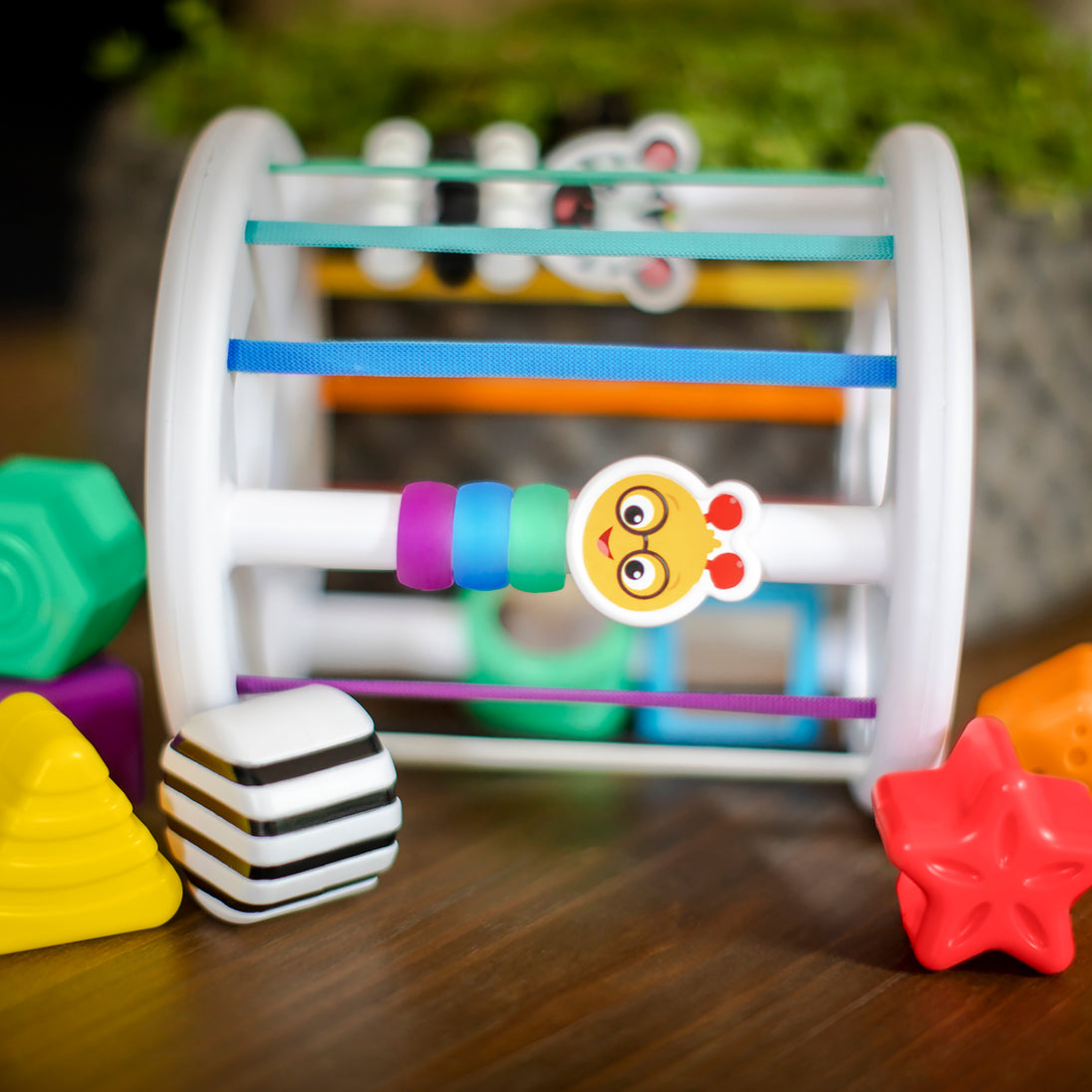 Zen the Zebra and Cal the Caterpillar are having a blast on their playground, and your little one’s invited! From shape sorting to imaginary play, this sensory toy offers endless ways to play, discover and explore. When they’re not busy turning and spinning the beads, characters, and mirror blocks on the sorter’s sides, baby can stretch the soft, elastic bands to reach for and grab the 6 colorful shape blocks.