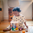 - Color and shape discovery – A total of 6 shape cutouts invite baby to match the colorful shape blocks and put them through both ends of the sorter