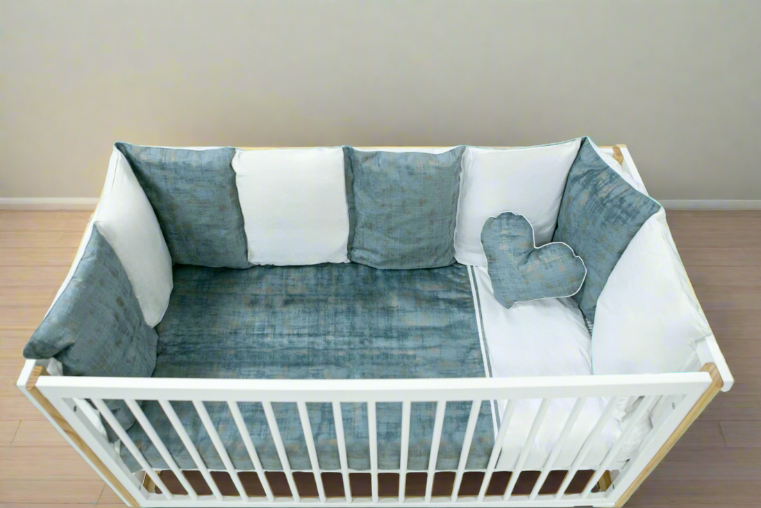 Our cozy and stylish Blue and White Selina Cot Bedding. Designed with a cot bumper feature, it ensures the safety of your little one while adding a touch of charm to their nursery. Say hello to peaceful sleep for your baby and peace of mind for you.