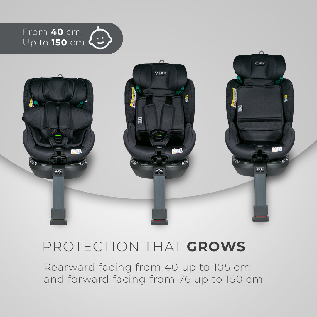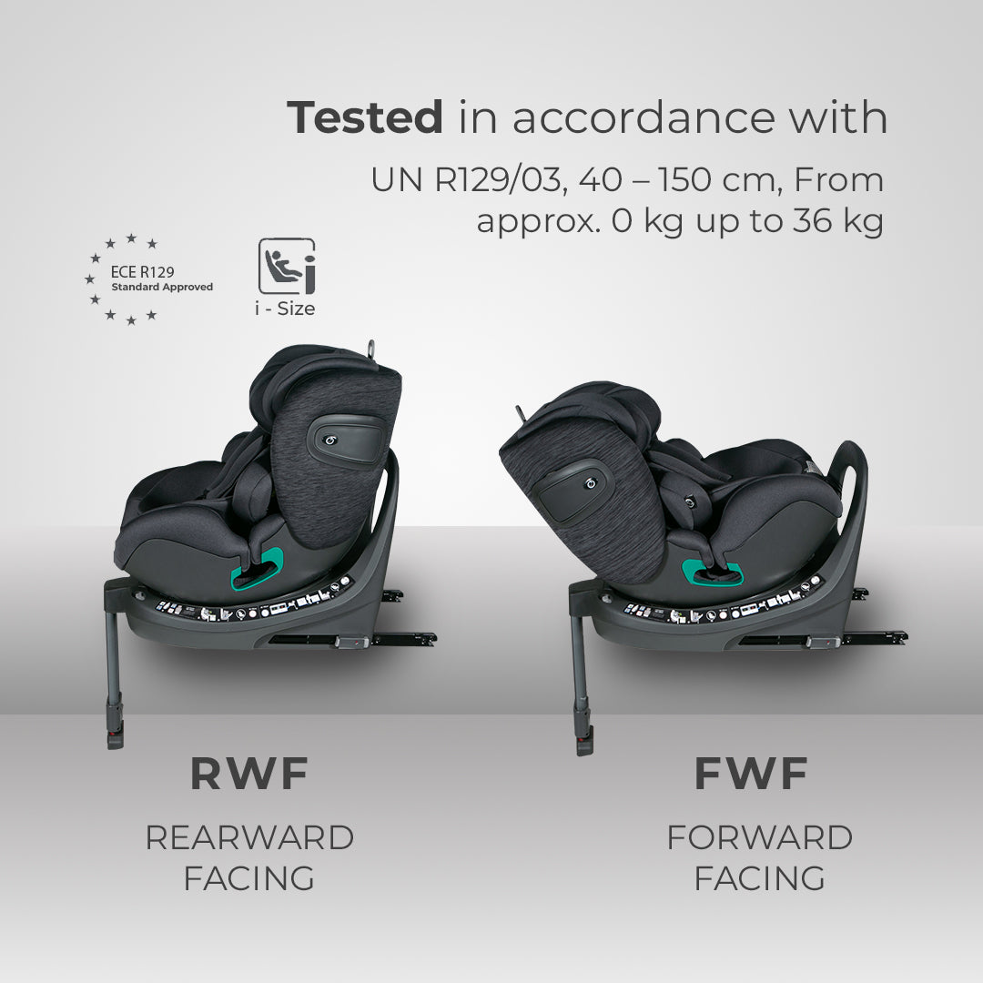 UN R129/03, 40 – 150 cm, From approx. 0 kg up to 36 kg. (From approx. birth up approx.12 years).