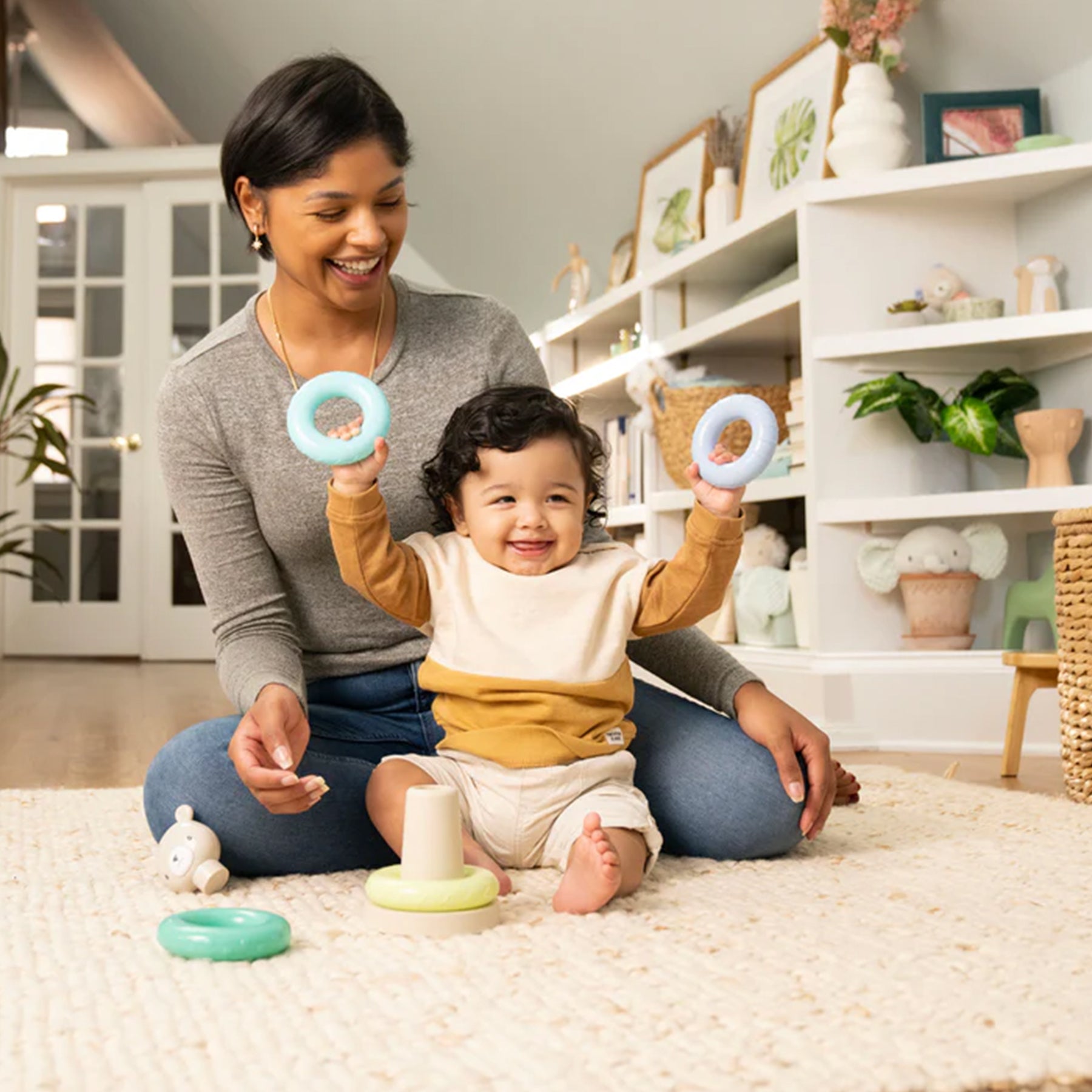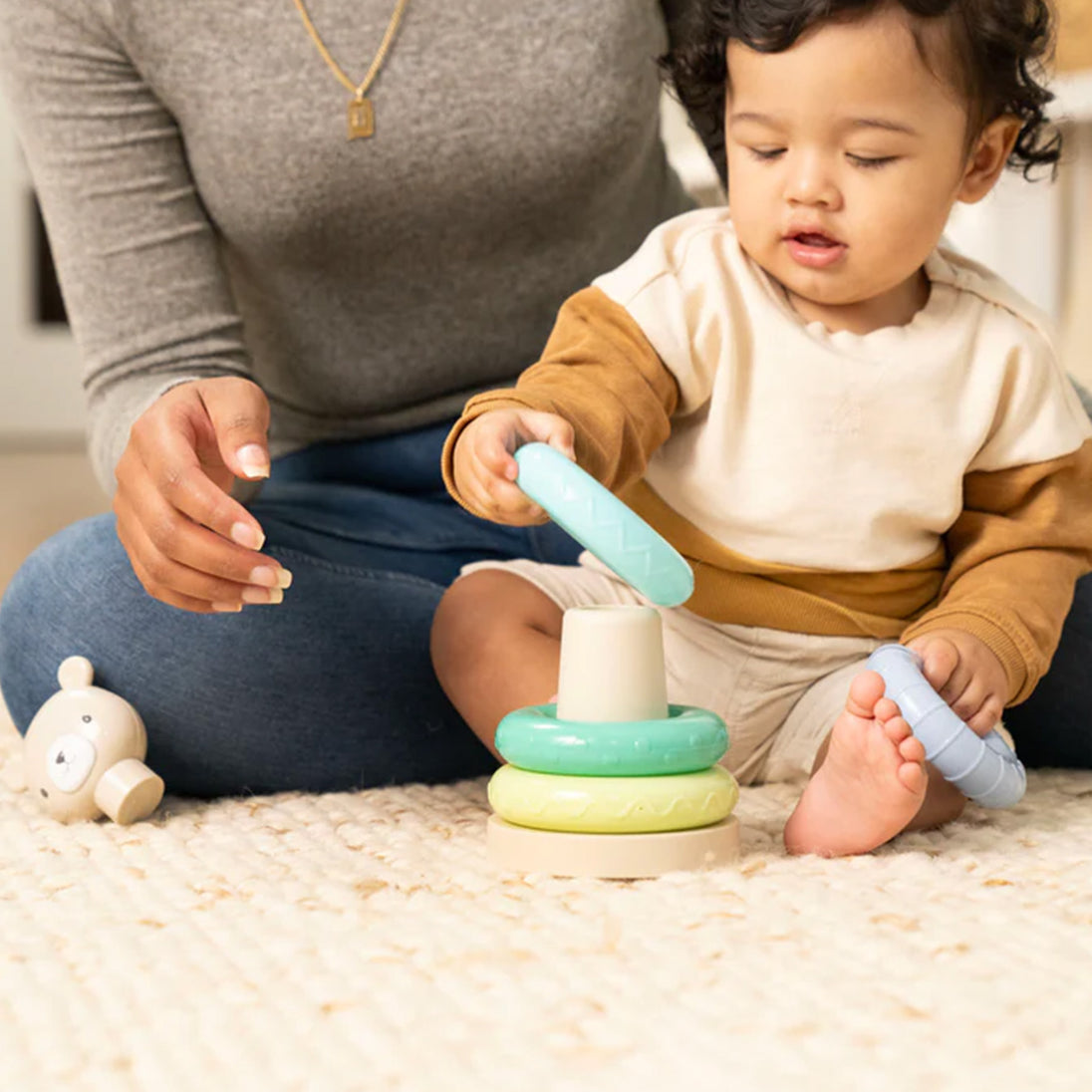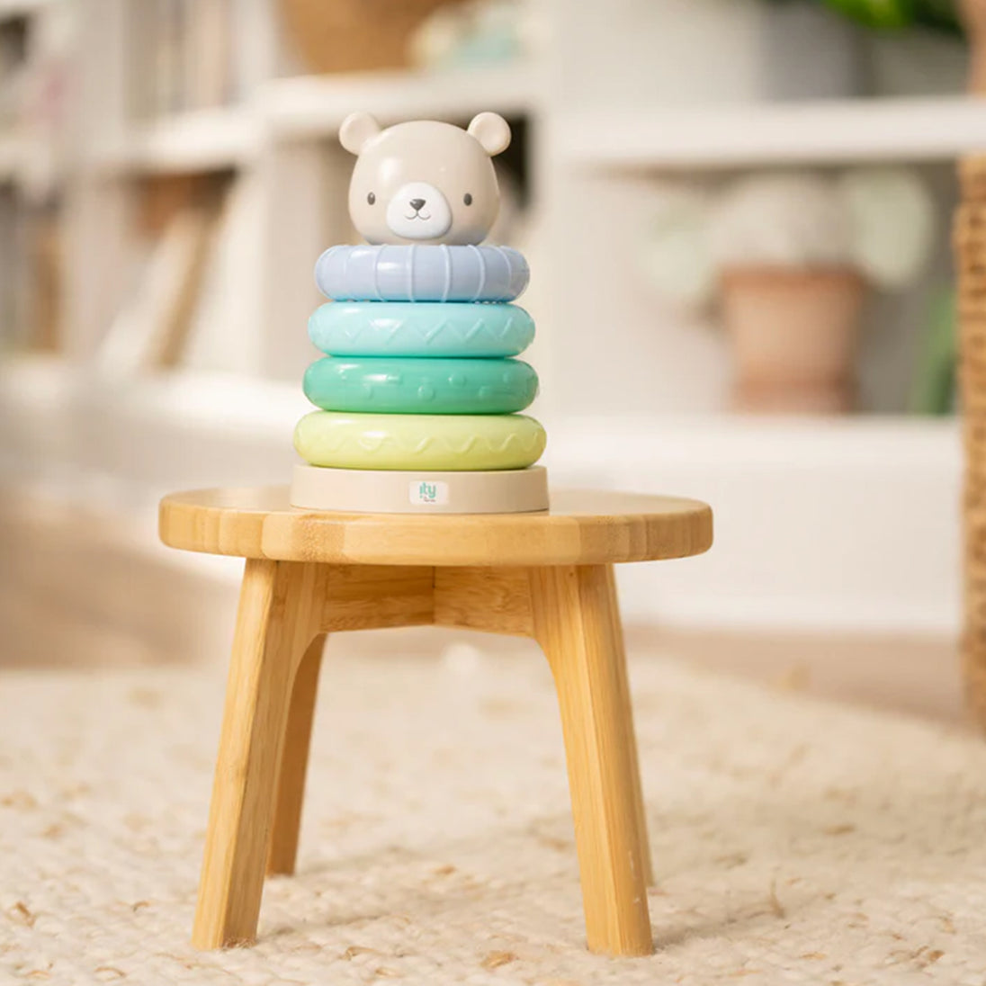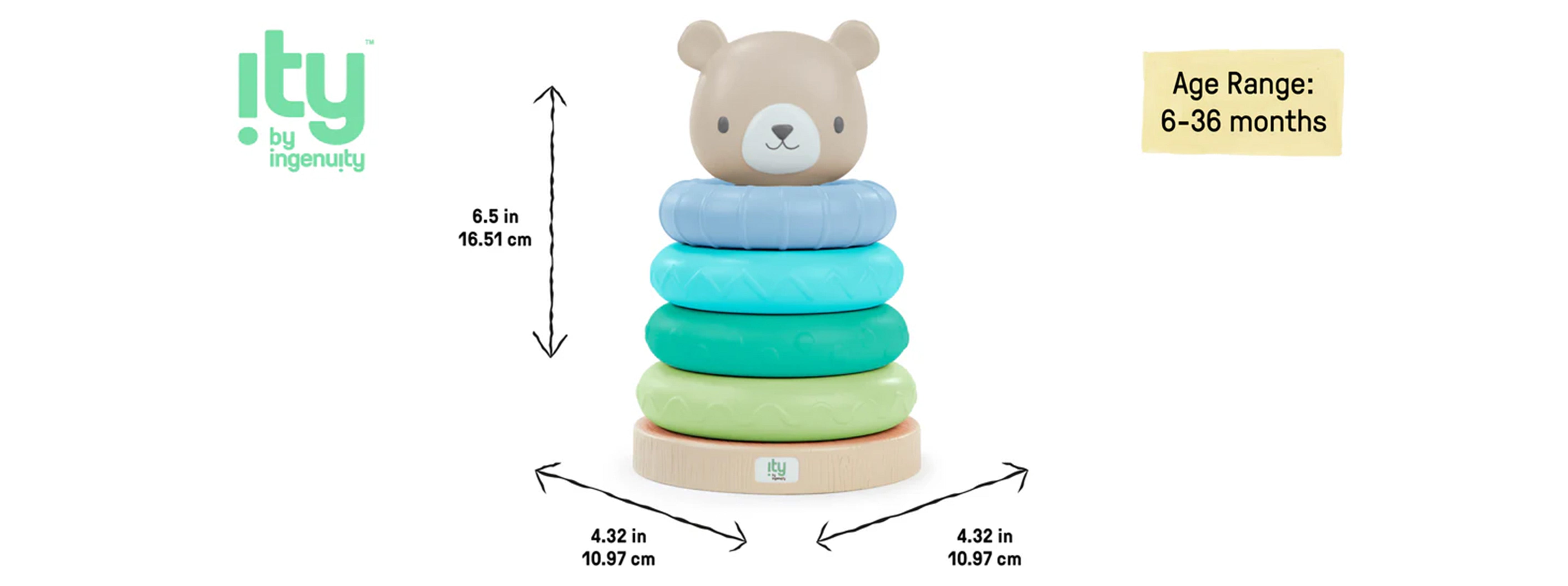 Unpack a wonderful way for infants and toddlers to discover textures and colors with the ity by Ingenuity Cutie Stacks - Nate! Adorable "a-ha" moments are only a stack away. Topped with super-cute Nate the bear, Cutie Stacks comes with a faux wood stand and 4 colorful, lightweight, BPA-free multi-textured rings that are easy for baby to hold and stack.