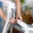 The rotating and removable wooden toy bar is sustainably sourced and adds a touch of luxe detail. Raffi the Giraffe and Casi the Zebra interactive toys provide colorful stimuli for play and detach for on the go fun. The seat rotates 180 degrees and swings in 3 directions, giving you a few handsfree moments. 6 speeds featuring our TrueSpeed weight sensing technology with timer and auto shut-off. When baby needs to be entertained, 8 melodies and 3 soft nature sounds keep your little one engaged. The swing motion and music is powered by a USB cord (included). A 5-point safety harness keeps baby secure as they relax.