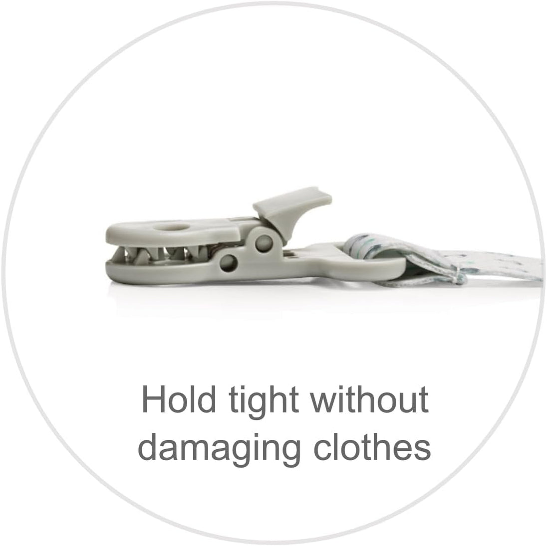 - Clips firmly onto clothing, bibs, or stroller straps without damage.