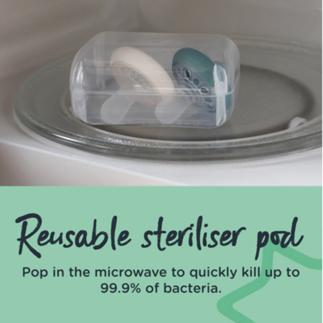 - Reusable steriliser pod: Pop in the microwave to quickly sterilise your soothers and kill up to 99.9% of bacteria. Doubles up as a travel case, to keep your soothers clean and sterile when on the go.