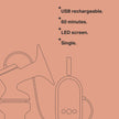 - USB Rechargeable: Powered by a USB rechargeable power unit so you can use this breast pump anywhere. Full charge gives you over 60 minutes of cord-free pump time