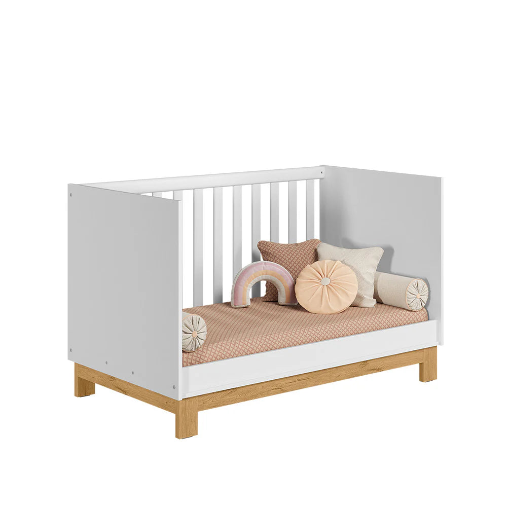 The Luan 2-in-1 Convertible Baby Crib is thoughtfully designed to grow with your little one seamlessly transitioning from a crib to a toddler bed. With its modern blend of white and oak finishes, it adds a touch of contemporary charm and warmth to any nursery space.