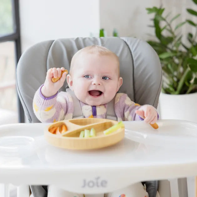 Height adjustable low-profile frame pulls right up to your table to double as a booster seat as your little one grows.