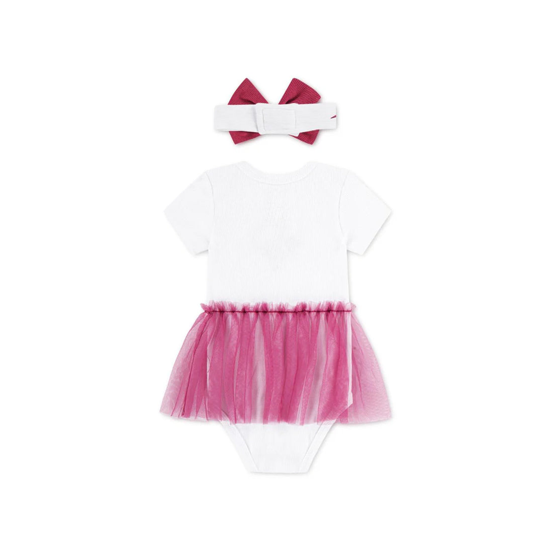 - A rib knit bodysuit featuring a playful contrast tutu skirt (tulle) and an embroidered script Swoosh logo, giving ballet vibes with a sporty twist.