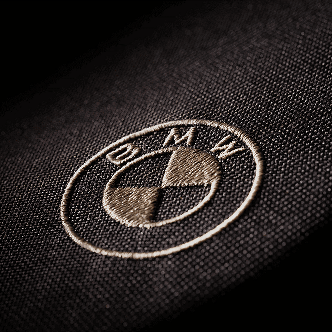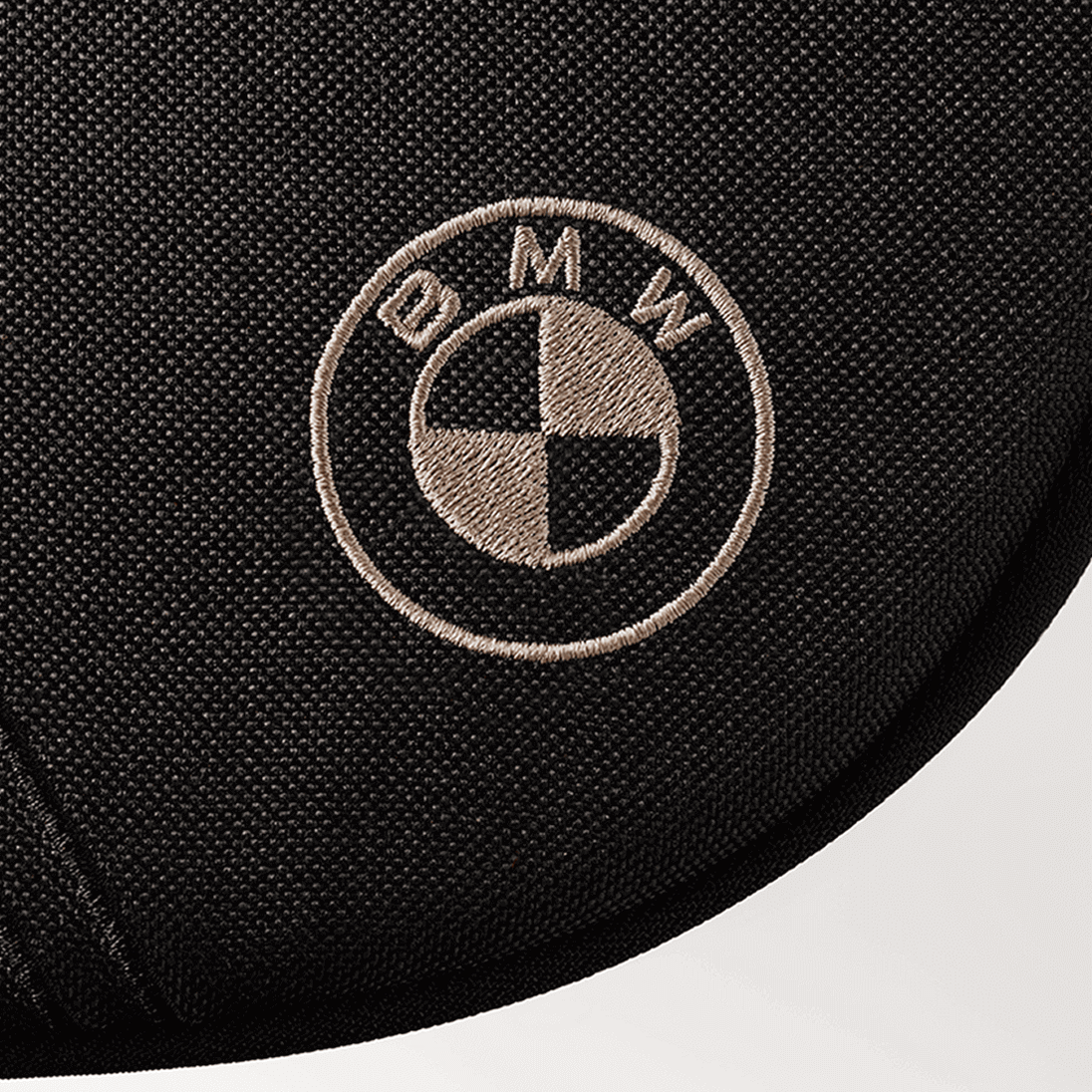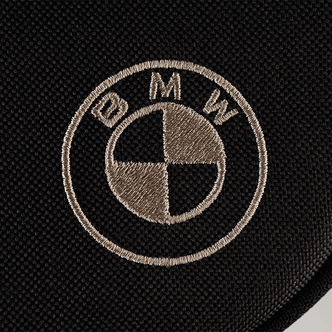 Dramatic carbon black featuring premium BMW logo accents, BMW Trinity pattern, and chocolate luxe leatherette accents.