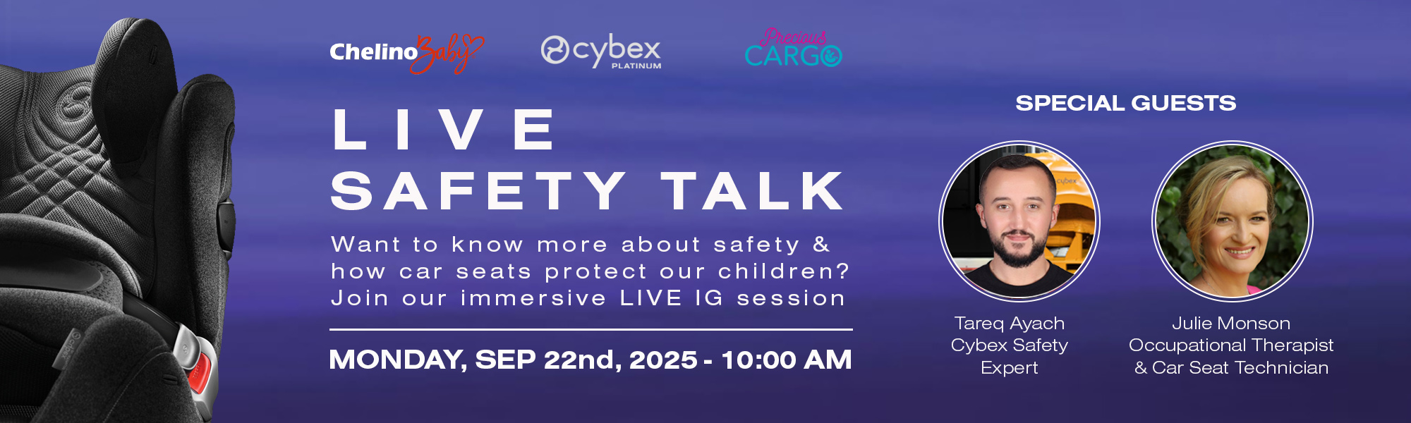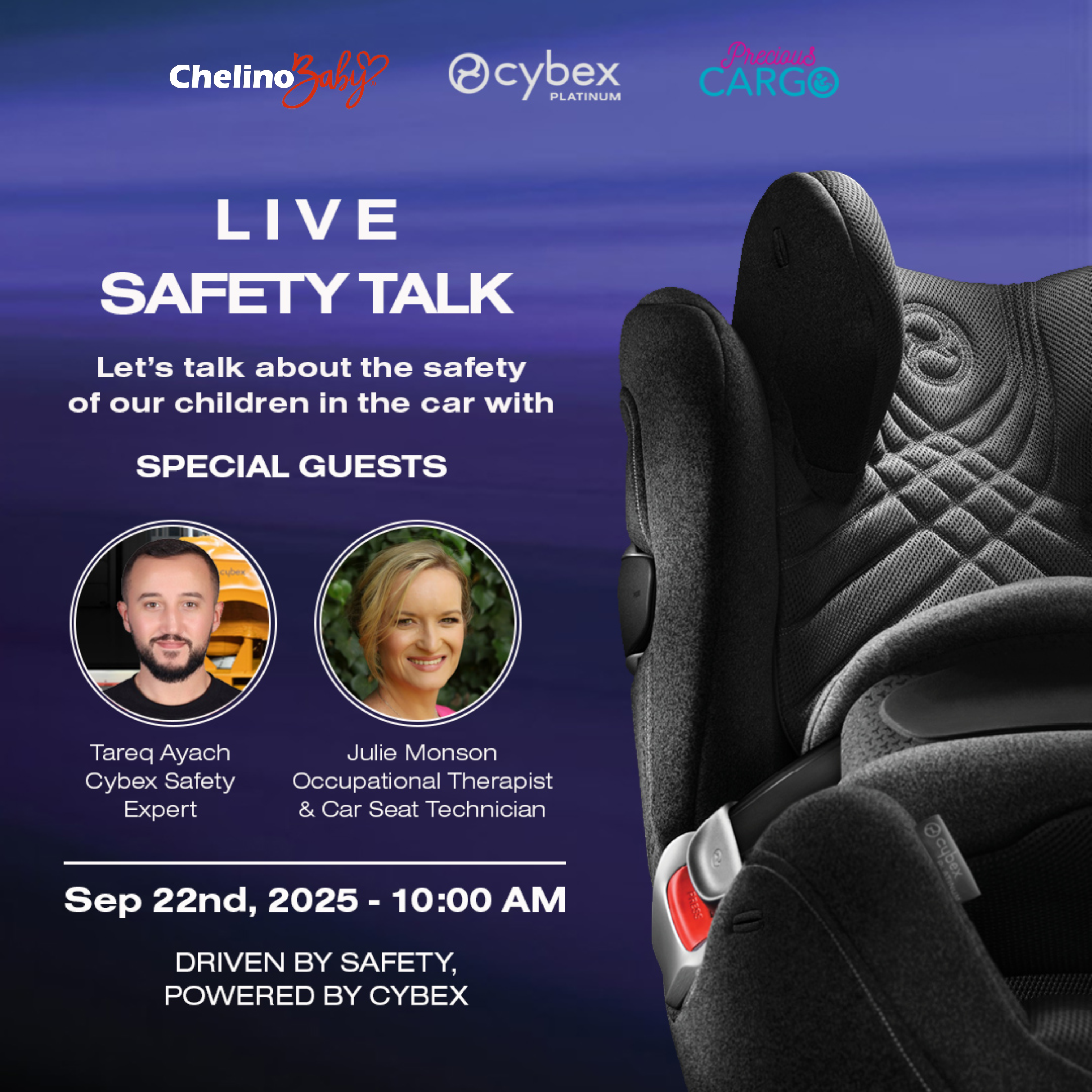 Join the experts: Tareq Ayach – Cybex Safety Expert and Julie Monson – Certified Car Safety Technician in South Africa. ChelinoBaby is proud to host its first ever Safety Talk live on Instagram during Child Car Seat Awareness Week.
