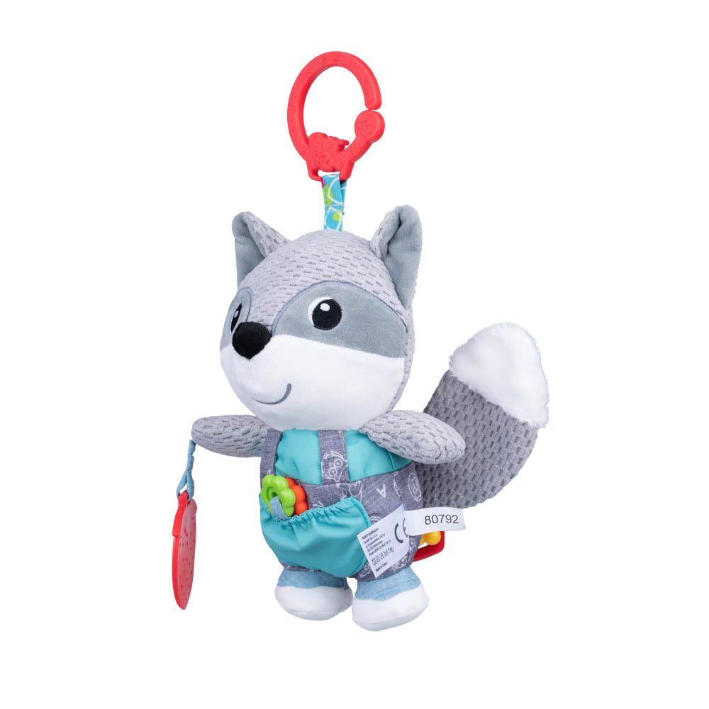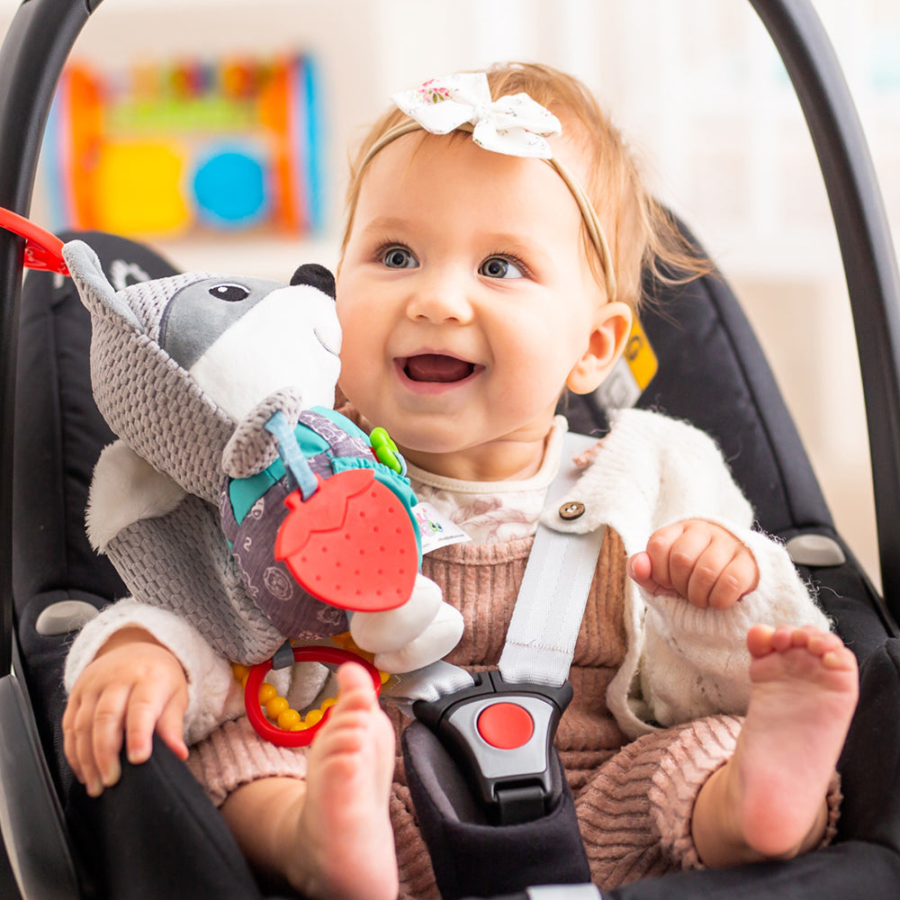 - Crinkle, rattle, and teether elements for sensory development