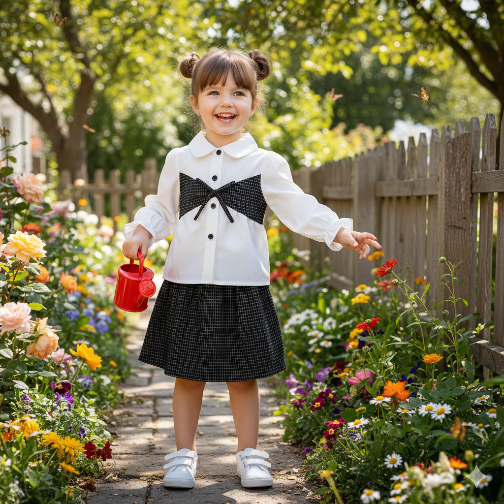 Dress your little one in charming style with this Check Bow 2 Piece Blouse with Mini Skirt Set. The blouse features a delicate check pattern and a sweet bow detail at the neckline, adding a playful yet sophisticated touch.