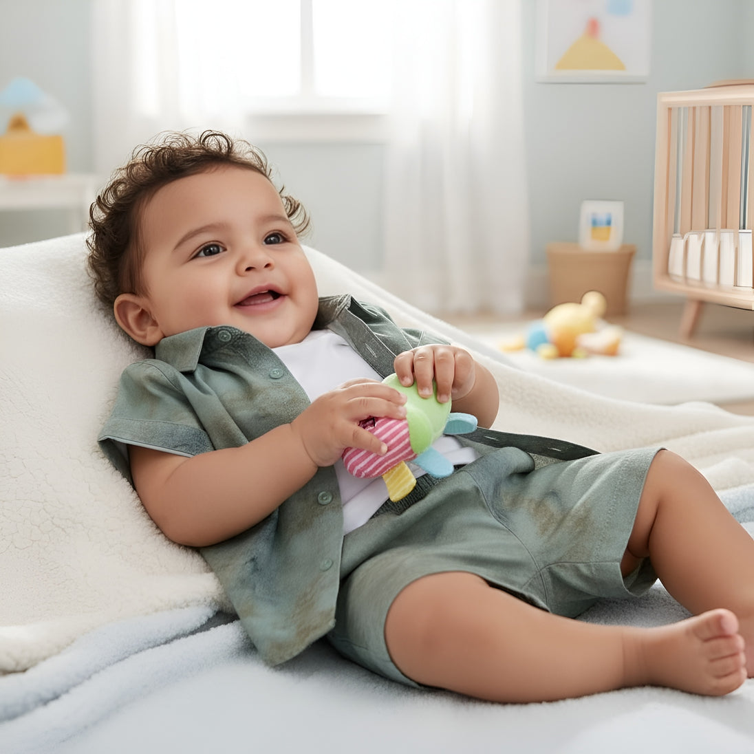 Give your little one a cool and timeless look with this stylish 3-piece denim-inspired set. It includes a soft short sleeve shirt, comfortable matching shorts, and a coordinating denim-style vest.