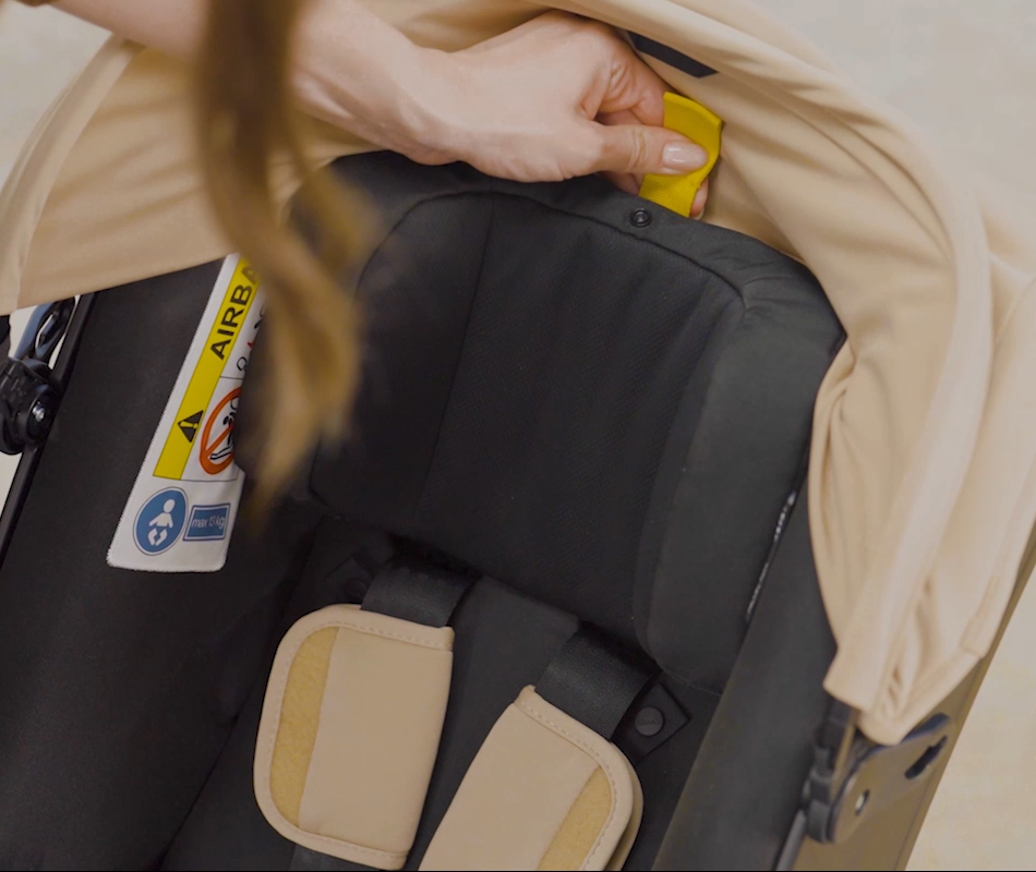 The self-fastening feature on the shoulder pads effortlessly attaches to the lower part of the headrest, simplifying the process of placing the child inside the Doona i Car Seat & Stroller.