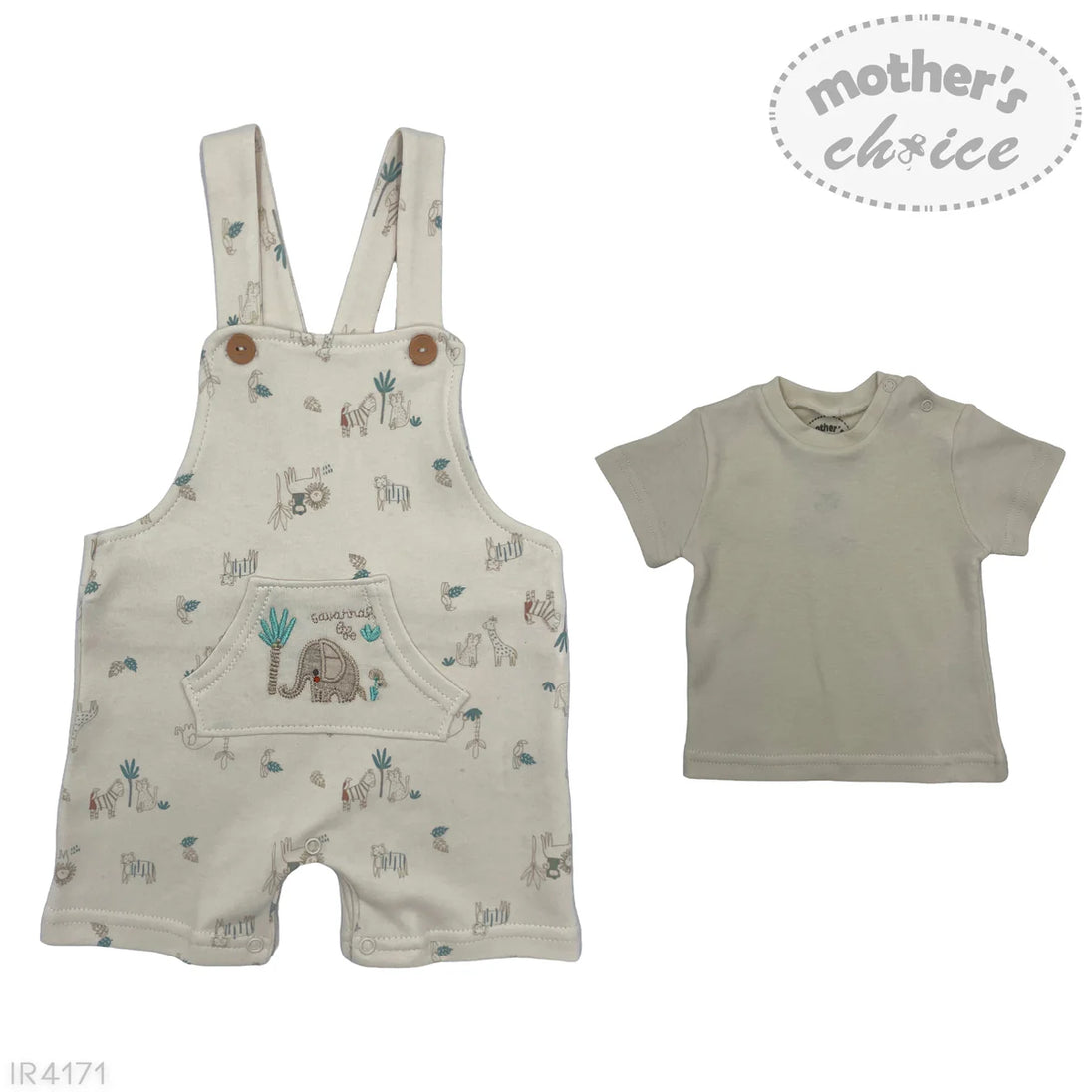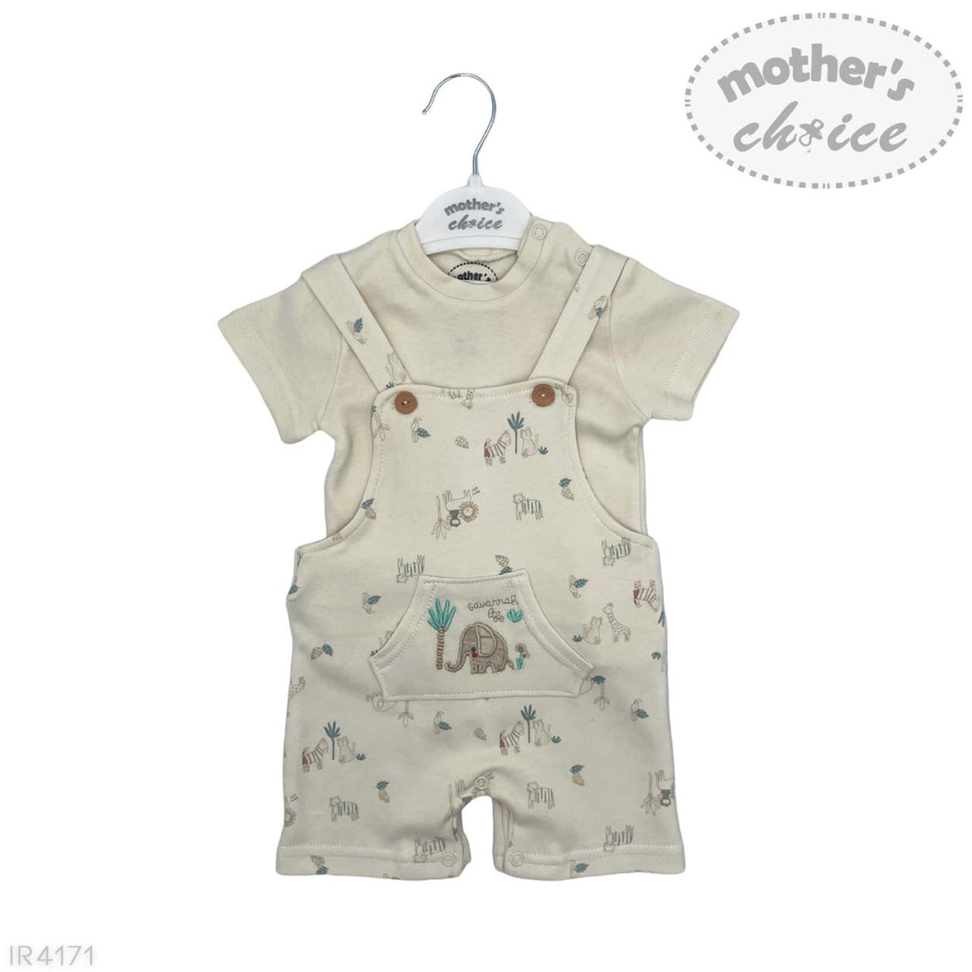 Dress your little explorer in adorable comfort with this Mother’s Choice Cool Safari Dungaree Set. Made from soft, breathable cotton, this 2-piece outfit includes a short-sleeve bodysuit and coordinating dungaree romper featuring charming safari animal prints elephants, giraffes, and zebras among playful greenery. The neutral cream tone makes it perfect for both baby boys and girls.