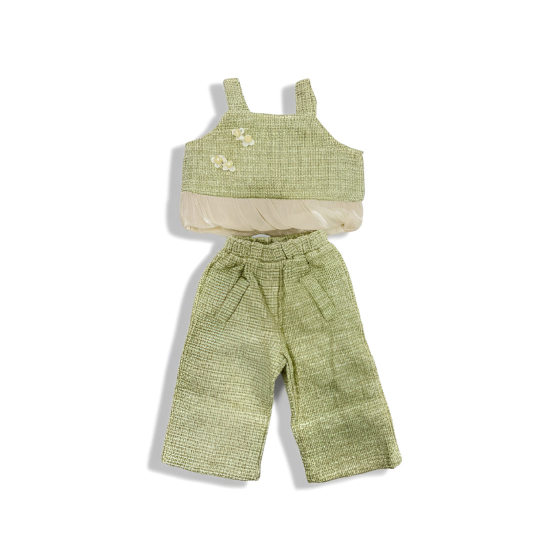 The Mini Tweeded Sleeveless Top & Pants Set in Mint Green combines modern elegance with everyday comfort. Crafted with a soft tweed-textured fabric, this outfit brings a premium, boutique-style look while remaining gentle and breathable for your little one’s skin.