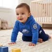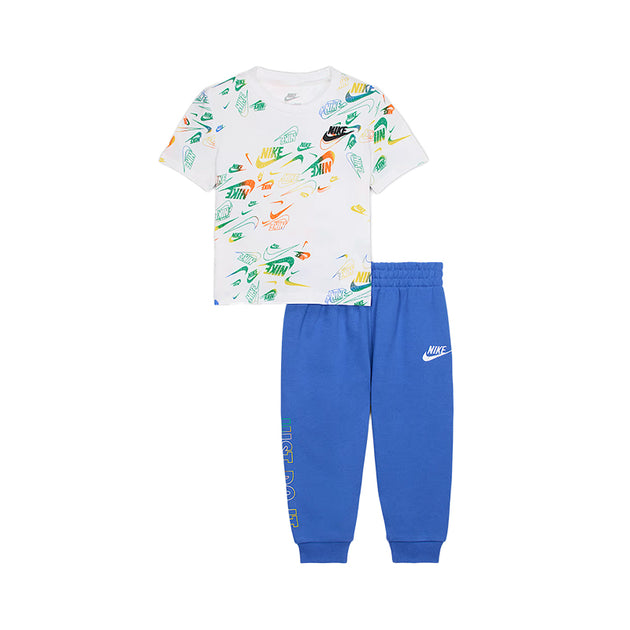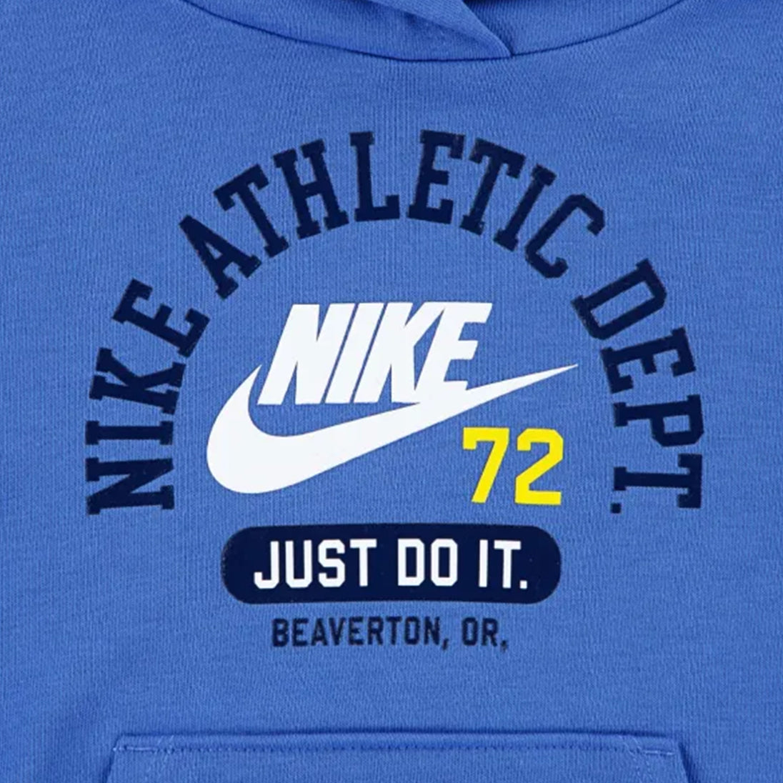 The hoodie features a relaxed fit for easy movement, while the pants come with an elastic waistband for a secure and comfortable fit. Finished with classic Nike branding, this set delivers a sporty look perfect for school, play, or casual outings.
